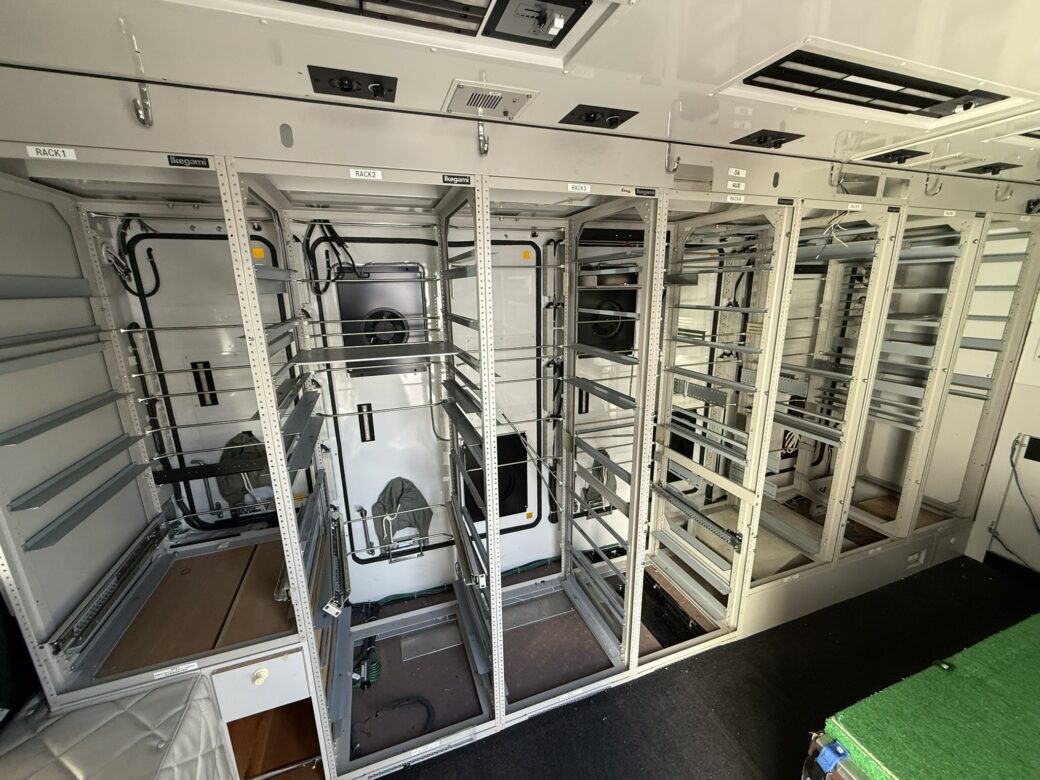 長さ598cm、幅210cm、高さ304cmとコンパクトですが、ラック7本と15kVA発電機、エアコン、ポール・ジャッキ等々装備充実で人気の形の中継車です。